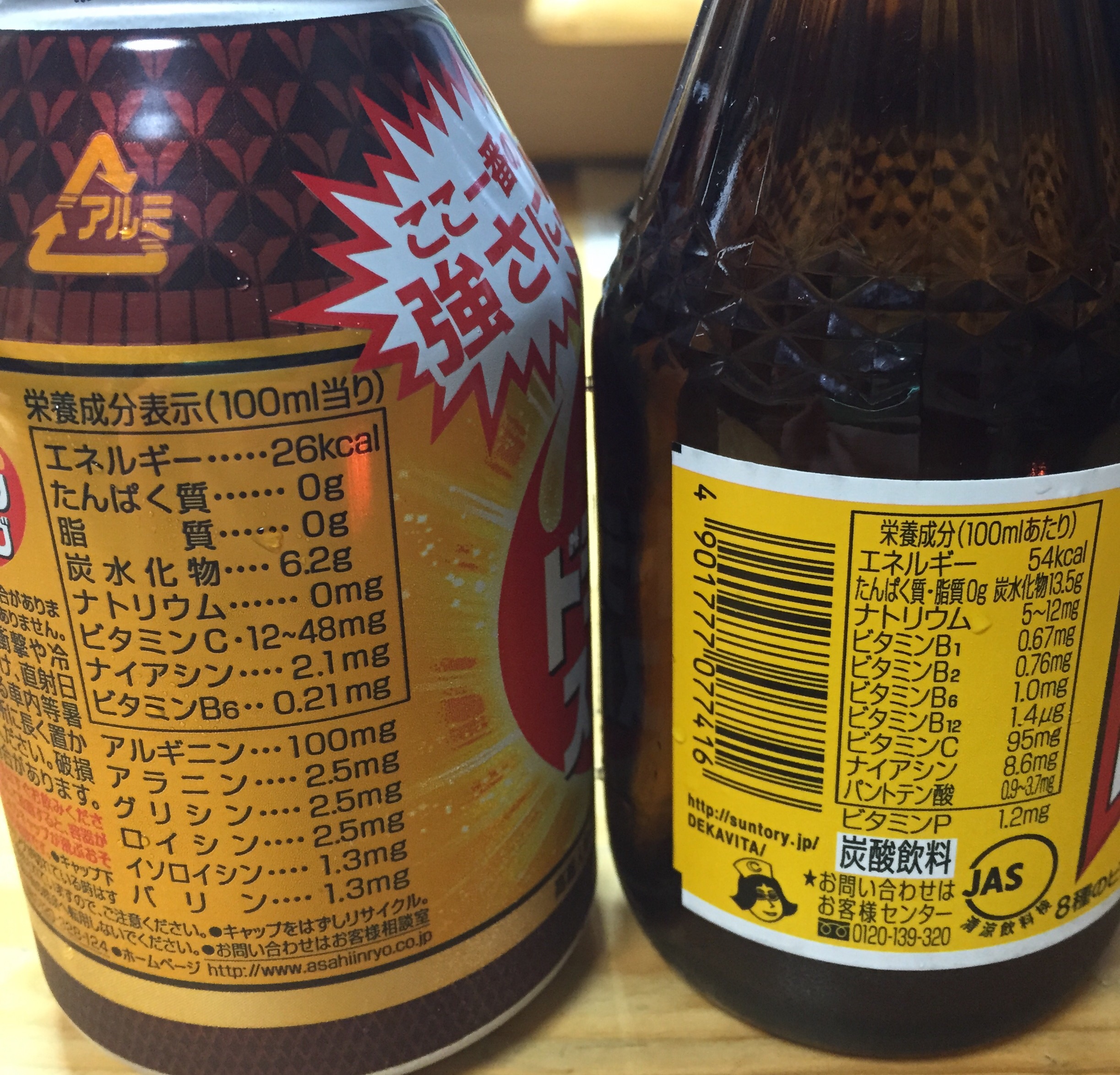 栄養成分表示。どちらも100mlあたりです。これを見る限り、デカビタの方が栄養ドリンクとしては優秀?
